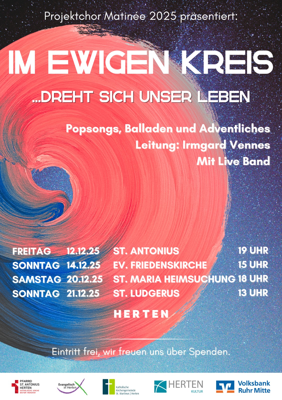 "Im ewigen Kreis" - so lautet der Name eines Konzerts, das am Sonntag, 14.12.25, um 15.00 Uhr in der Friedenskirche stattfinden wird.